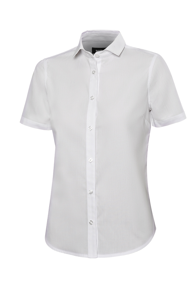 Camisa semientallada de mujer de manga corta. Cierre central con botones y pinzas de pecho.