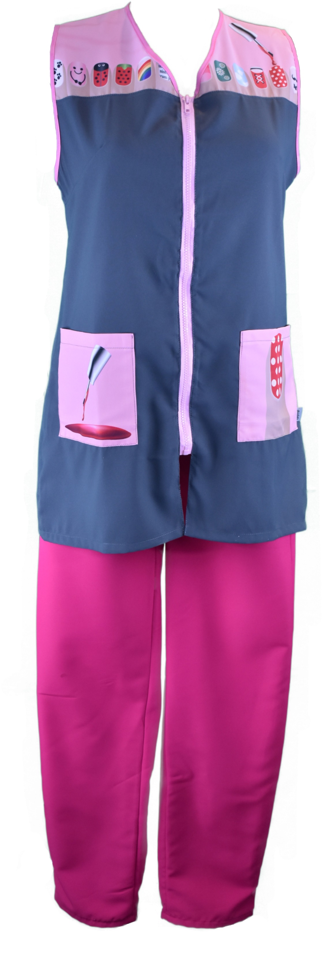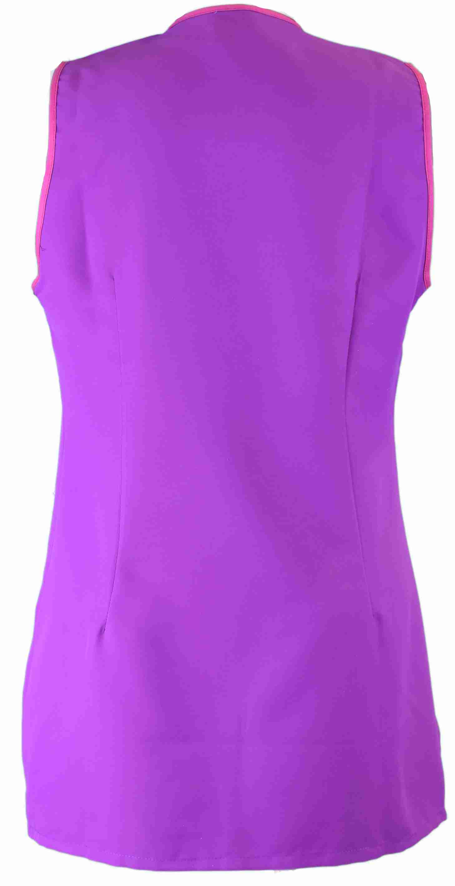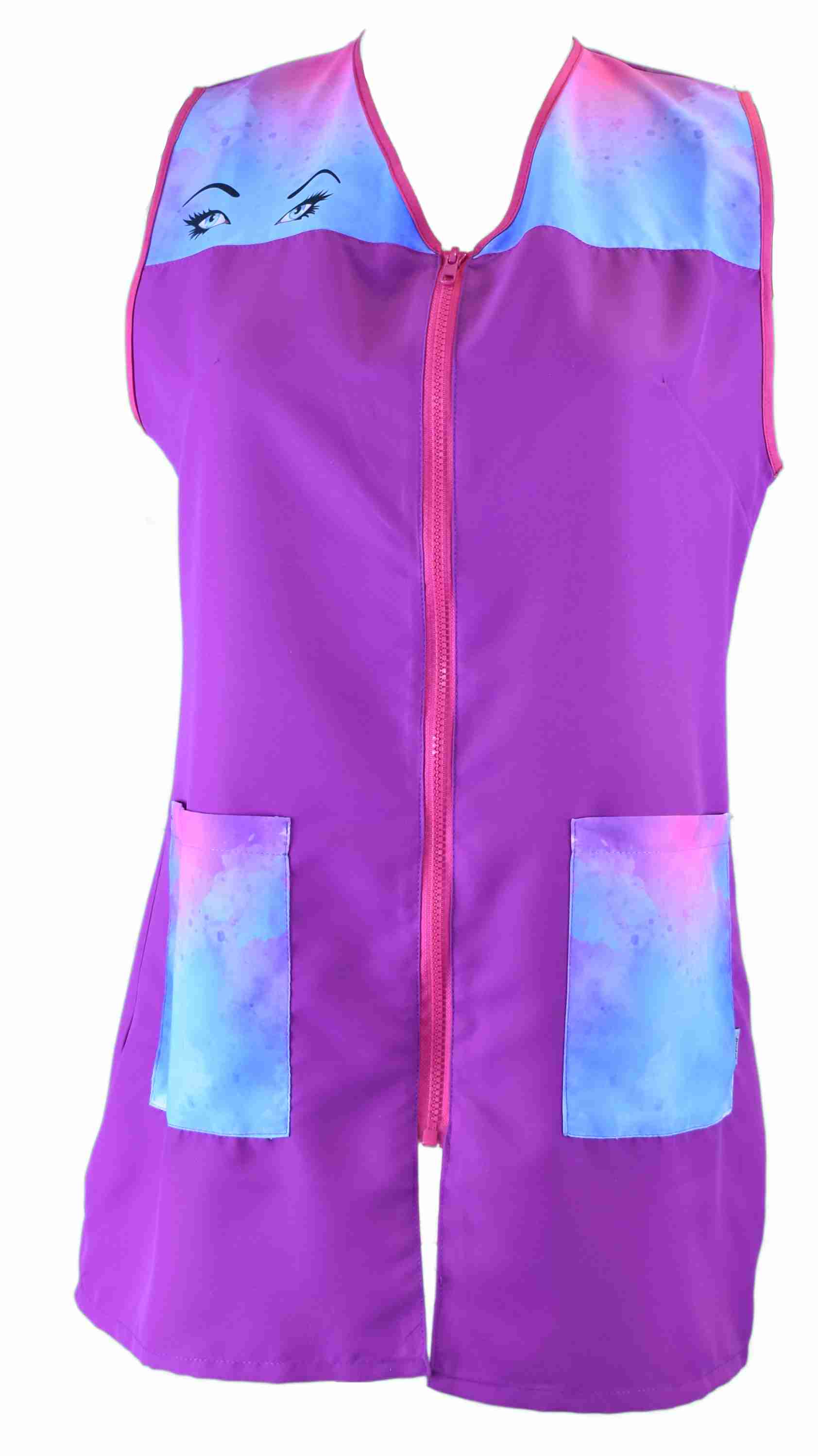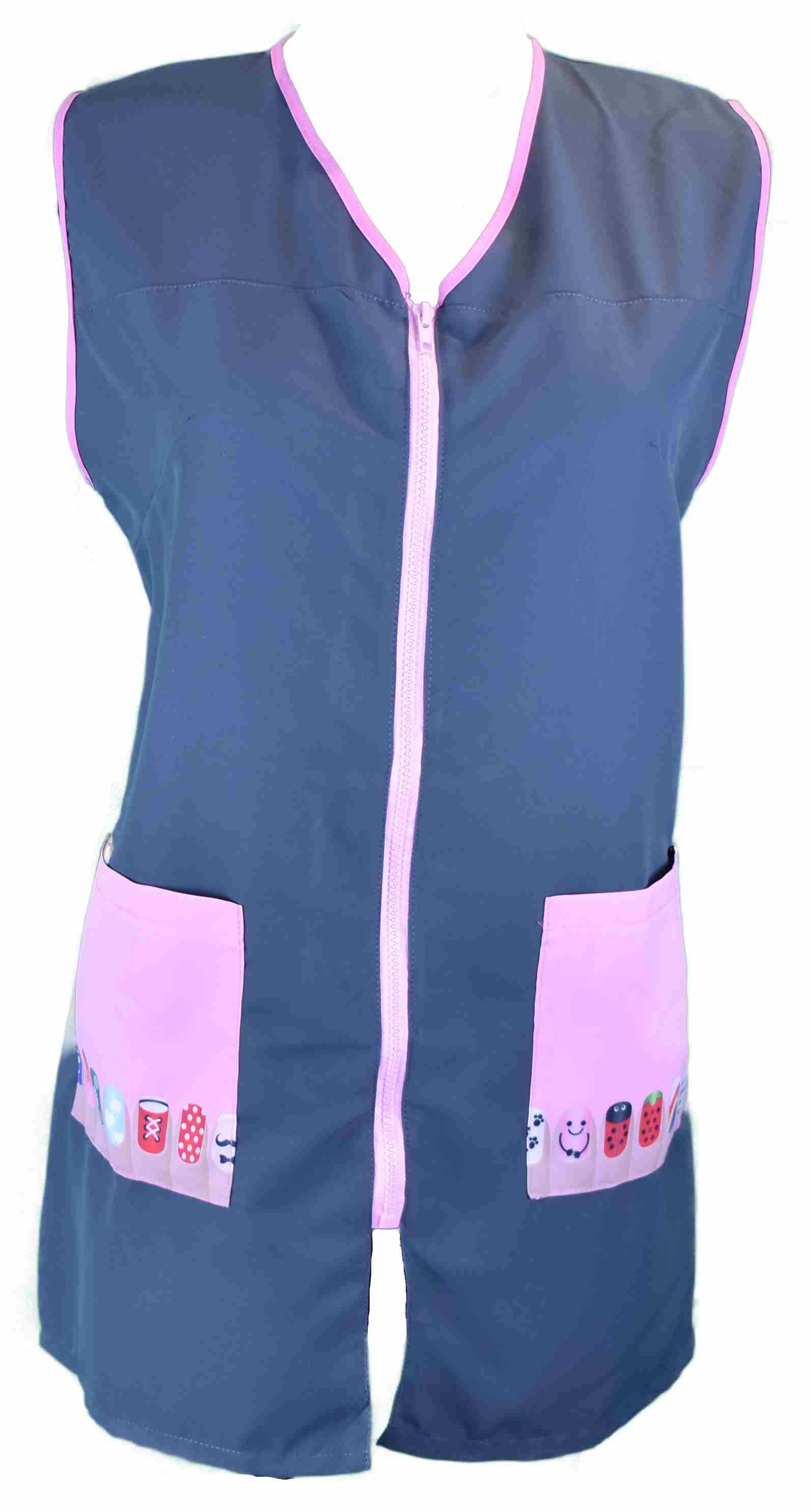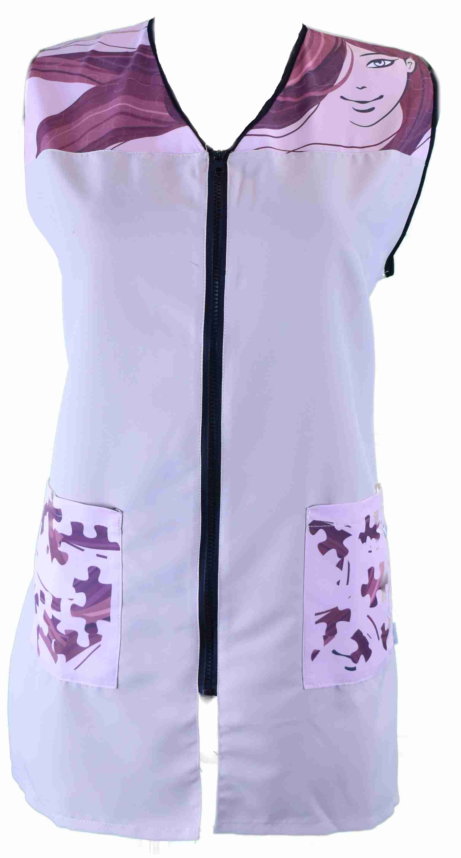 Bata mujer sin mangas con cierre central de cremallera y vivos en color contraste, dos bolsillos delanteros, pinzas en sisas y espalda. Canesú y bolsillos estampados.