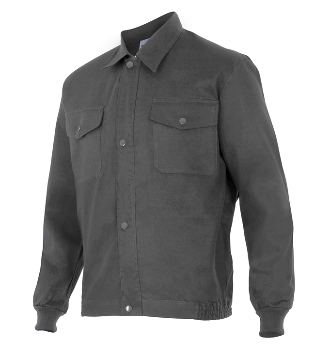 Cazadora con cremallera central oculta con tapeta.Puños de canalé, dos bolsillos en el pecho, botones de presión en tapeta y bolsillos, pliegue en la espalda y cintura con elástico en los laterales.