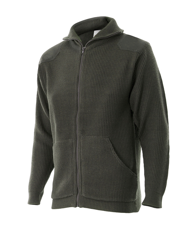 Chaqueta de punto de cuello alto con tratamiento antipilling. Cierre central de cremallera, cuello, puños y cinturilla de canalé, dos bolsillos inferiores y refuerzo de tejido en hombros y codos. Punto canalé. 100% Acrílico. Galga 7