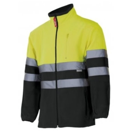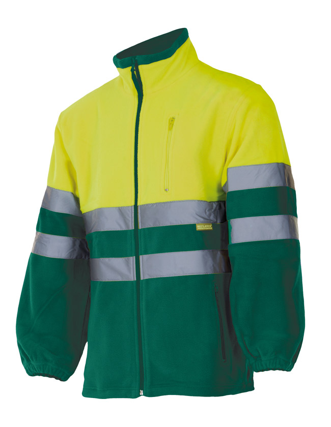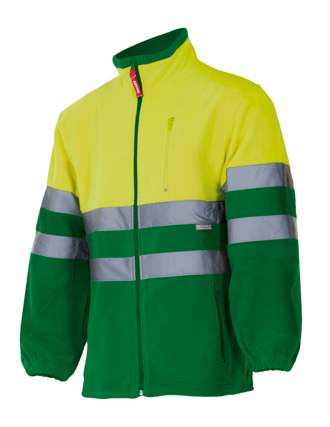 Cintas reflectantes en torso y mangas. Cuello alto con cremallera central, goma elástica en el bajo de la manga y tres bolsillos con cremallera.