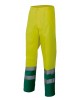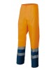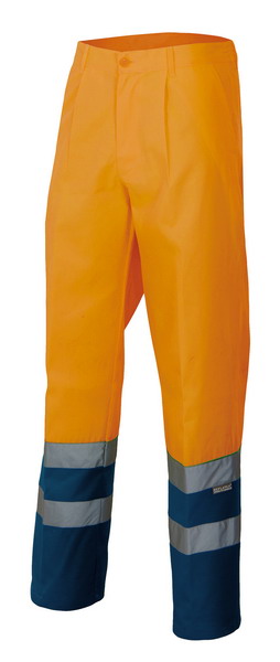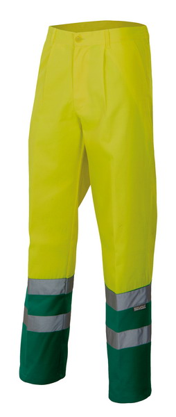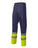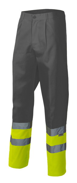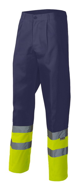 Cierre central con cremallera y botón. Cintas reflectantes en las piernas. Elástico en la cintura, cuatro bolsillos y pespunte trasero de seguridad.