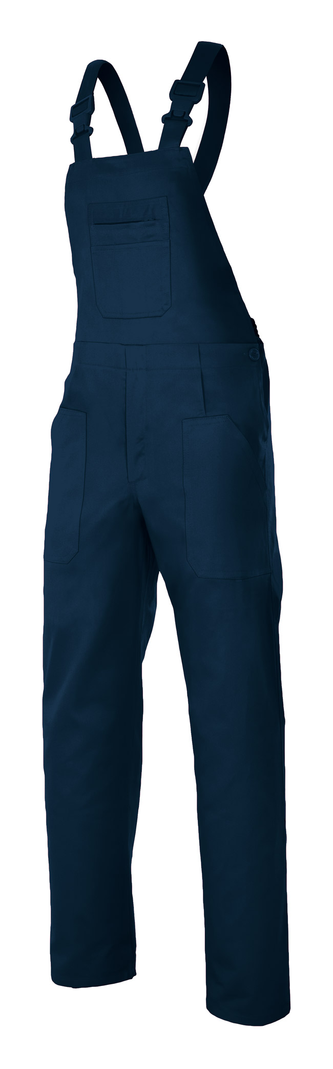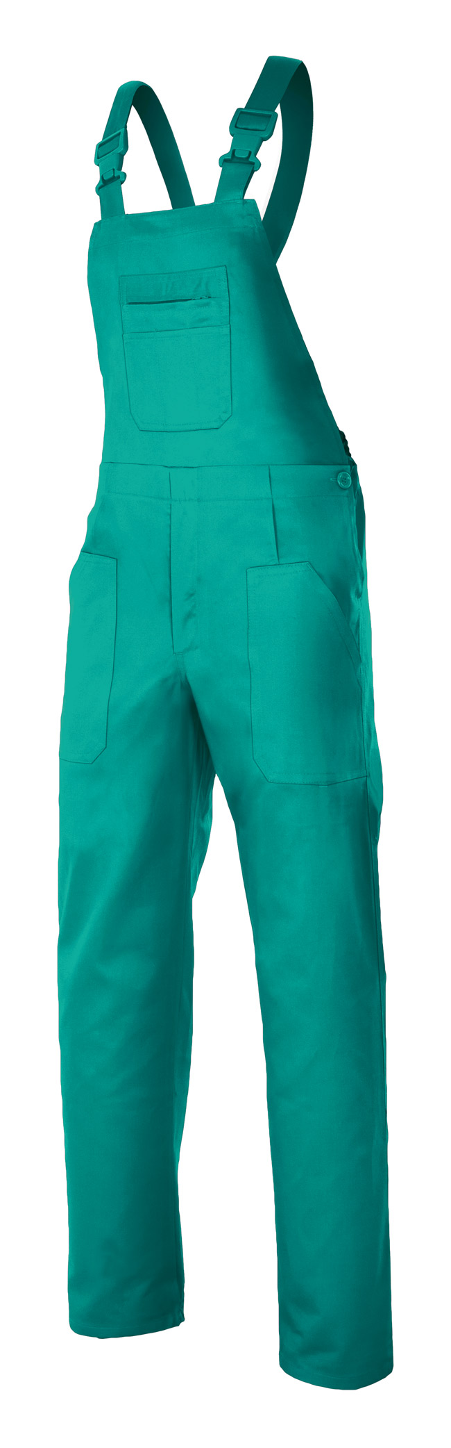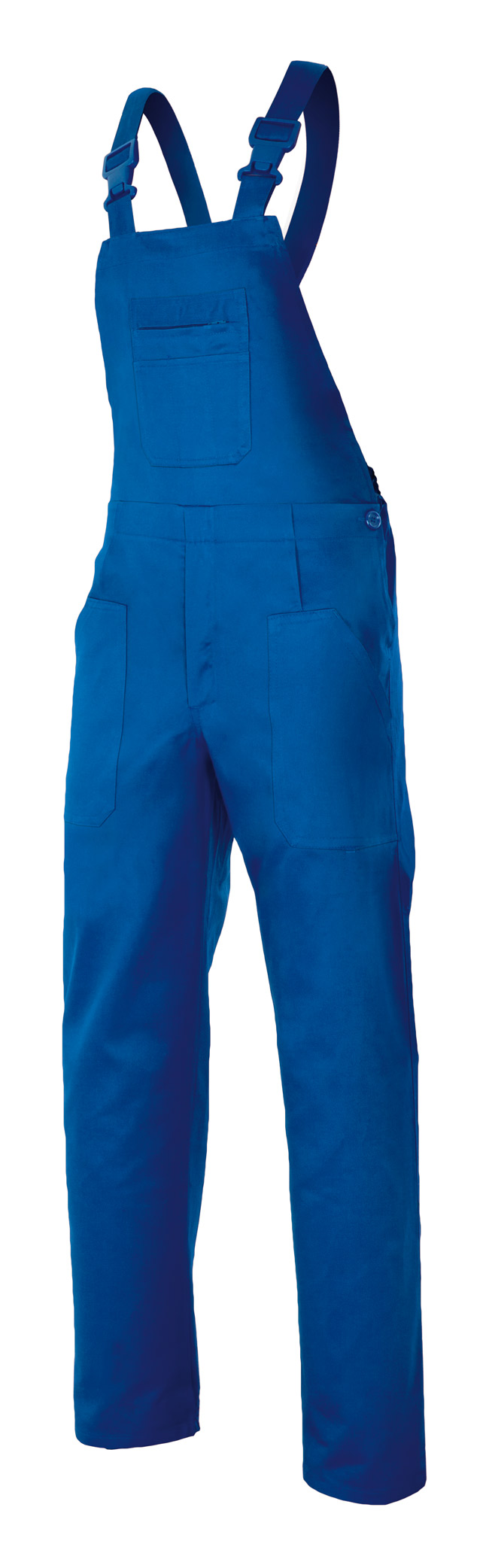 Pantalón con peto con pinzas y goma elástica en el interior de la cinturilla de la espalda y en los tirantes. Hebillas de PVC, seis bolsillos de parche y botones en los laterales de la cintura. Doble costura de seguridad.