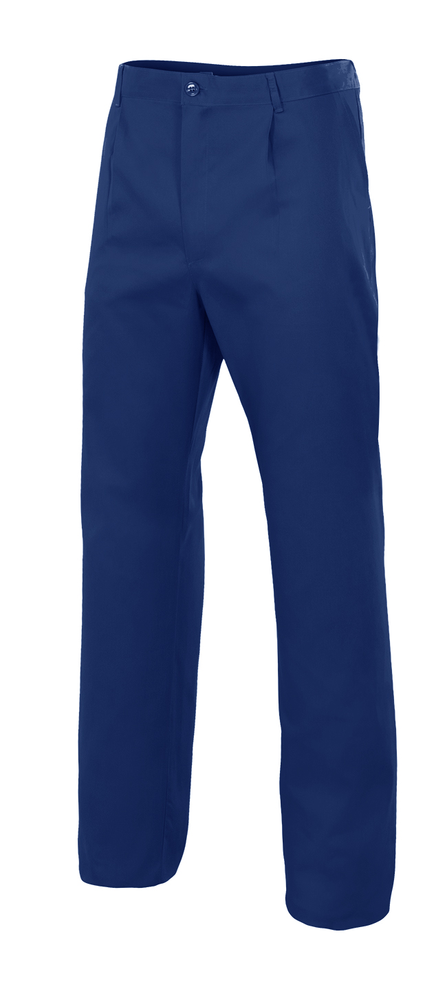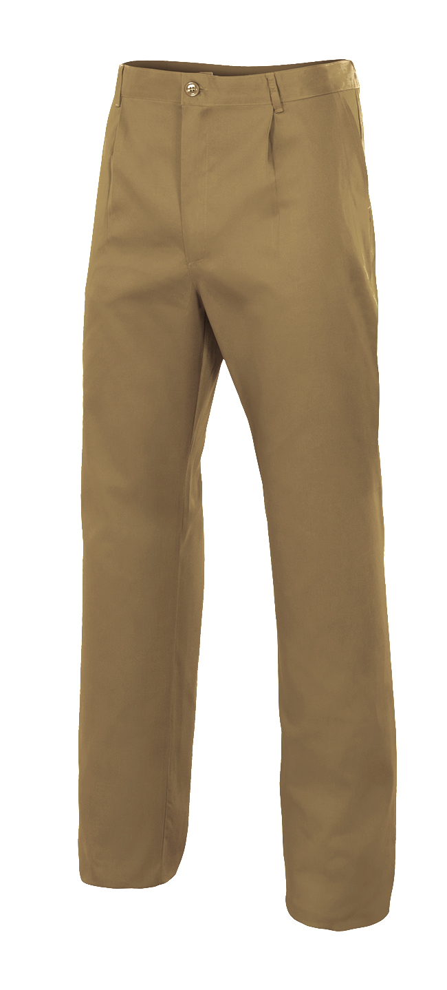 Pantalón con pinzas y goma elástica en el interior de la cinturilla de la espalda. Dos bolsillos franceses y uno trasero con tapeta y botón además de un bolsillo lateral. Pespunte trasero de seguridad.