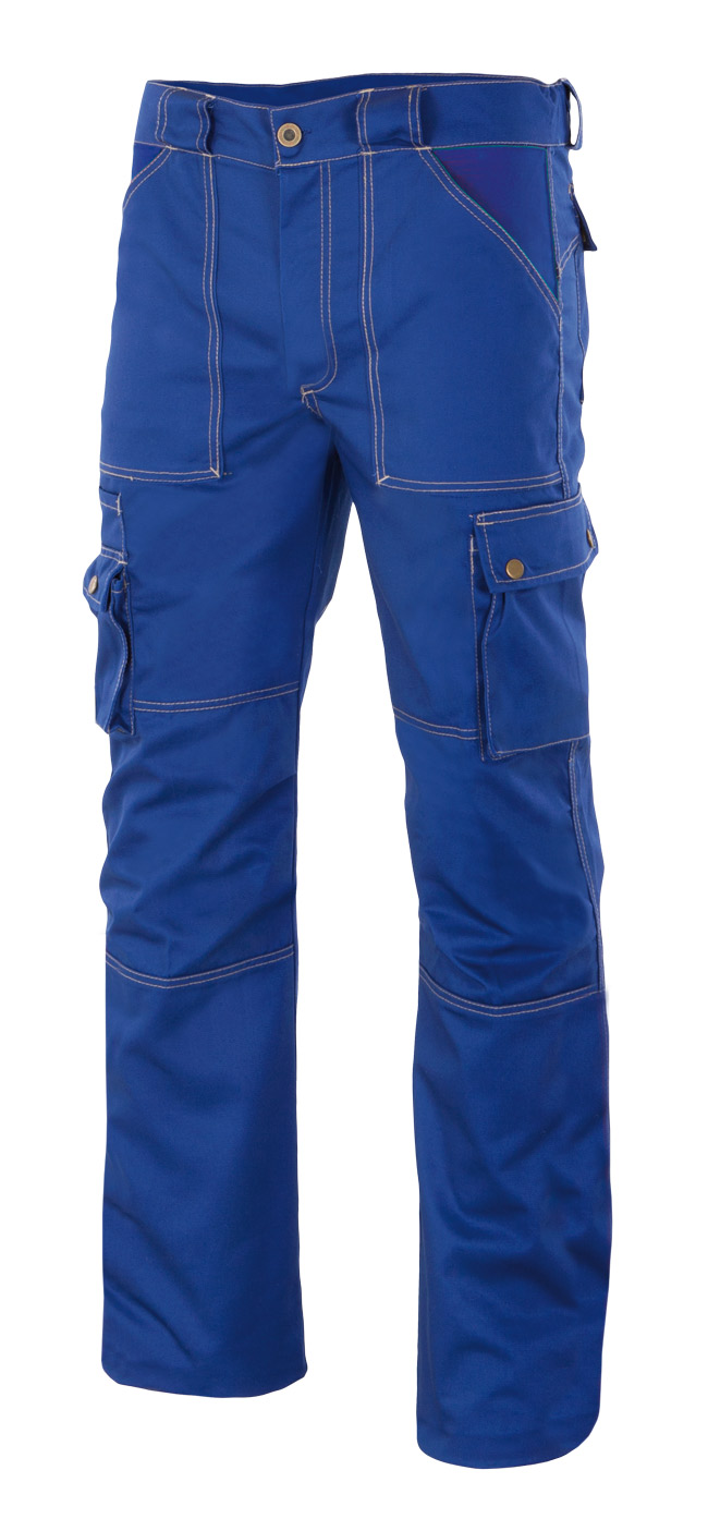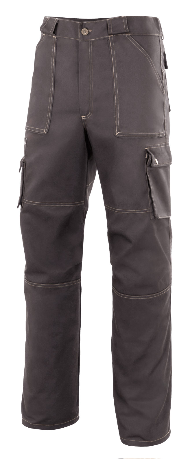 Pantalón multibolsillos con refuerzo de tejido en trasero y rodillas. Con pinzas en las rodillas, goma elástica en el interior de la cinturilla de la espalda, varios bolsillos con tapeta y botones automáticos. Pespunte trasero de seguridad. Refuerzo rodillas-trasero / Alto gramaje