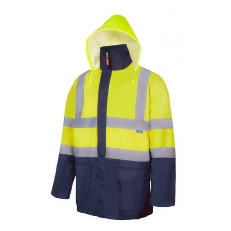 Parka / Chubasquero: - Cierre central con cremallera, oculta con tapeta. - Tapeta central con cierre de velcro. - Cintas reflectantes en torso, hombros y mangas. - Capucha oculta en el interior del cuello. - Puños de canalé. - Dos bolsillos inferiores de parche, con tapeta y velcro.