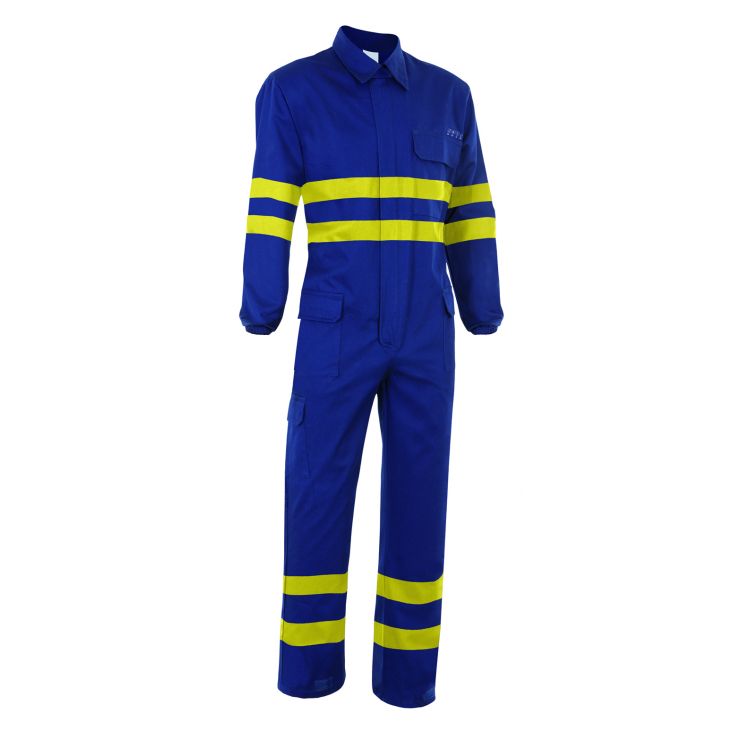 Mono ignífugo - antiestático con cintas reflectantes en torso, mangas y bajo de las piernas, con cierre central con cremallera de doble cursor oculta con tapeta con cierre de velcro. Cuello con trabilla, cinturilla elástica, puños elásticos, doble costura de seguridad y bajos ajustables con velcro. Cinco bolsillos, 1 en el pecho, 2 interiores, 1 pierna derecha y 1 trasero, todos de parche con tapetas y velcro.