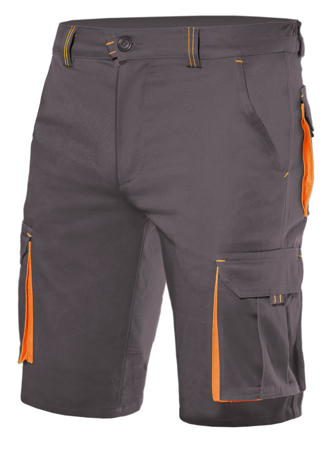 Bermuda Stretch multibolsillo bicolor, con cierre central de cremallera y botón, color de contraste en fuelles, tiradores y presillas, refuerzo de tejido trasero, cinturilla elástica, doble costura de seguridad y seis bolsillos.